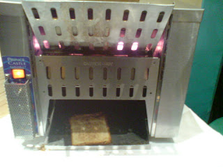 Alors, meme si tout est dans le titre, je vous explique. Vous chargez les toasts en haut, et ils sont entraînés par une grille roulante qui les fait passer entre 2 grills. Puis vous les dépose en bas. Génial… Et zou. Bon petit déjeuner à l’hotel new port bay club à eurodisney. Toine
